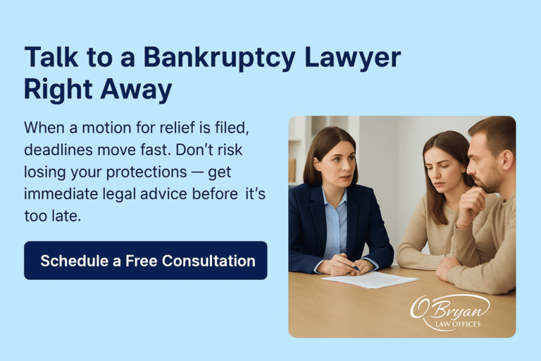 At O’Bryan Law Offices, our team of experienced bankruptcy attorneys in Louisville helps clients understand and respond to these types of motions every day. If you’ve received notice of a motion for relief from stay, it’s important to act quickly and know your legal rights.