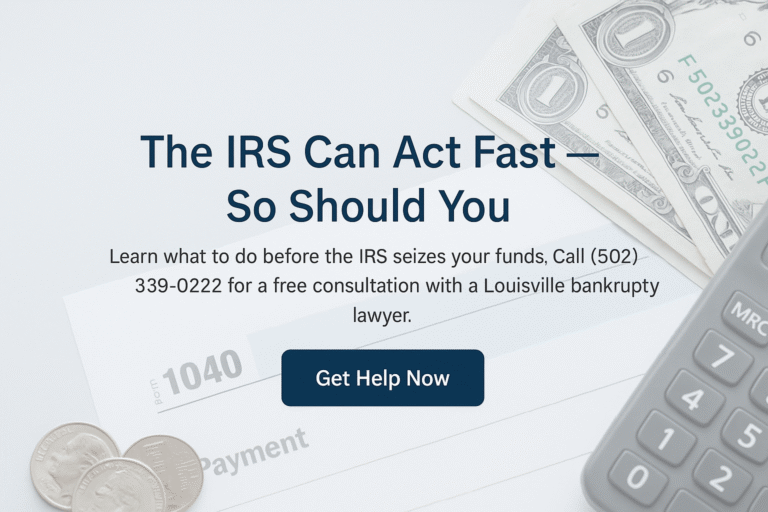 However, this is a last resort measure. If you receive an IRS notice about levying your account, take it seriously and contact O’Bryan Law Offices in Louisville. We strongly advise you to contact one of our experienced bankruptcy lawyers as soon as possible to determine your legal needs and build a strategy.